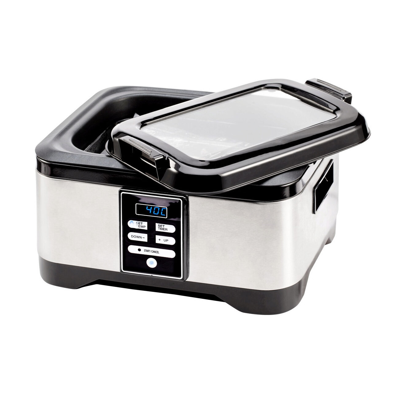 Aparat de gatit la temperatura joasa tip Sous-Vide – tehnica Master Chef-ilor, acum la tine acasa! • Acum poti gati la temperatura perfecta carne rosie, peste, pui sau legume. • Niciodata nu a fost atat de usor! • Condimenteaza sau marineaza produsul dorit • Introdu-l in punga vacuum si sigileaza-l • Alege temperatura si timpul necesare pentru produs, cum este prevazut in manual • Introdu punga in aparat, inchide capacul si asteapta pana cand expira timpul necesar • Scoate produsul si asezoneaza-l, functie de gustul dorit • Foarte precis! Gradatie temperatura - 1°C si gradatie timp 1 min. • Capacitate vas 5,7 lt, 6 portii. • Capac transparent anti-picurare, produsul poate fi verificat in timpul gatirii, fara a deschide capacul. • Curatare usoara, vasul detasabil, cu strat anti-lipire. • Design robust, carcasa din otel inoxidabil slefuit. • 450 W, 230V, greutate 4.25 kg, dimensiuni 36x28x23 cm; dimensiuni cuva exterior 36x28x12 cm, interior 26x18x10 cm; lungime cablu 103 cm.