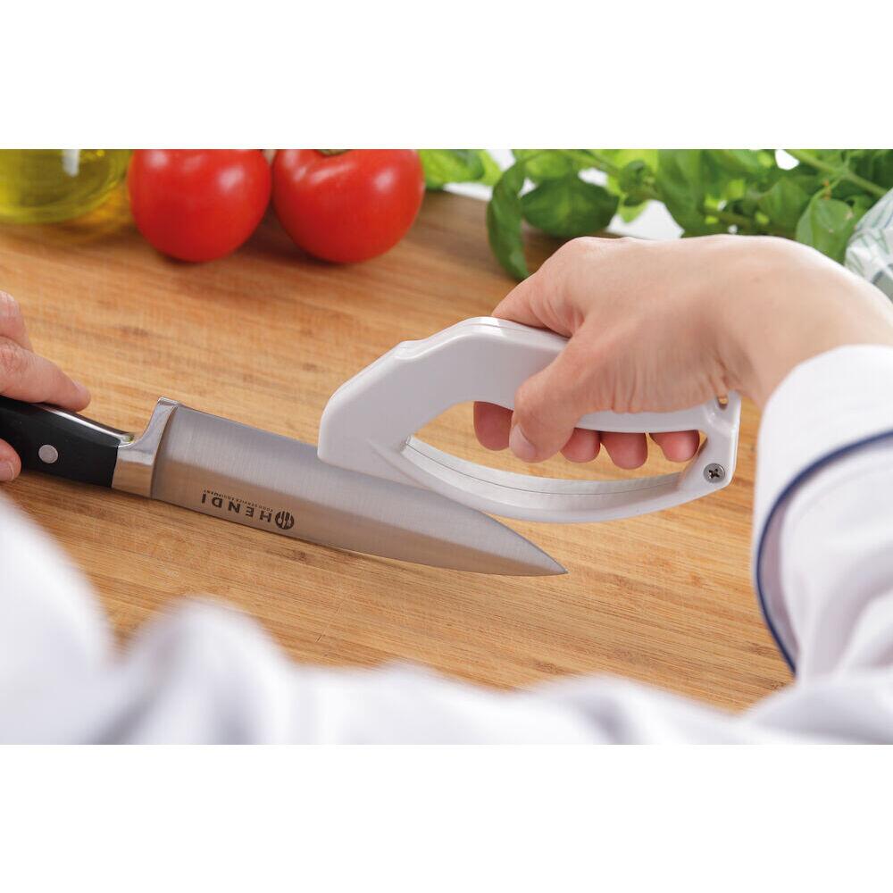 Ascuțitorul pentru cuțite HENDI este adecvat pentru toate tipurile de cuțite, inclusiv pentru lamele zimțate.