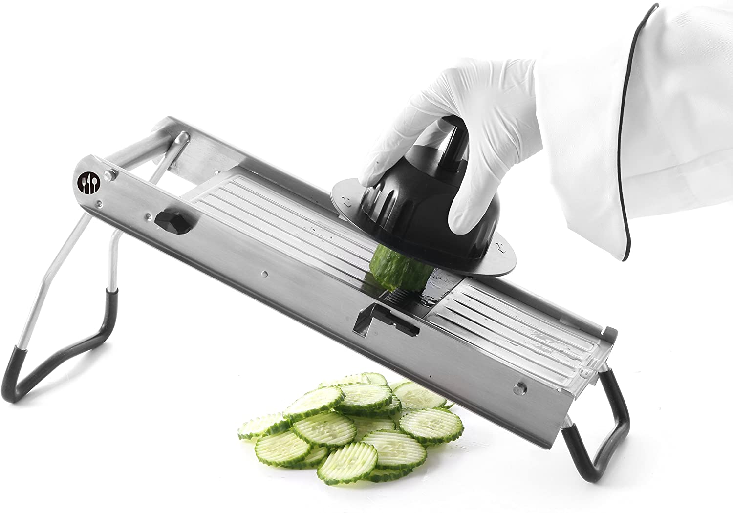 Răzătoarea tip mandolină Hendi este prevăzută cu un stativ antialunecare și 5 lame pentru diferite tipuri de tăiere