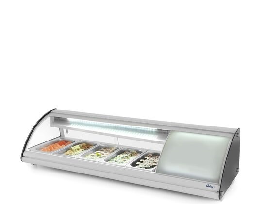 Accesul la această vitrină frigorifică de sushi de la Hendi este asigurat prin ușile glisante duble din spate, dar și prin geamul frontal tip capac