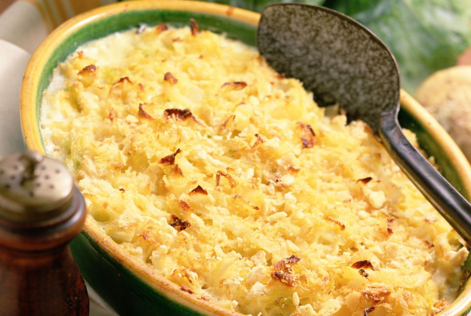 Prazul se taie rondele și se călește puțin în unt și ulei de măsline. După ce prazul s-a înmuiat, se adaugă varza. Se lasă să se călească puțin și să se mai evapore din suc. Se tapetează cu ulei și pesmet o tavă, apoi se așază un strat de varză, altul de brânză Cheddar rasă, iar peste ultimul strat de varză se toarnă smântâna amestecată cu cașcaval. Se lasă la cuptor până capătă o crustă aurie.