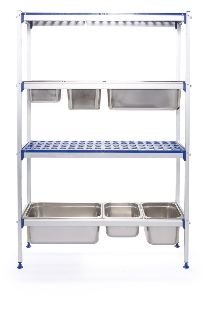 Rafturile de depozitare sunt accesorii indispensabile într-o bucătărie profesională, pentru că ajută la buna ei organizare. Rafturile de depozitare de aluminiu pentru vaschete sunt ușor de extins și sunt dotate cu rafturi din polipropilenă ce se pot curăța la mașina de spălat vase.