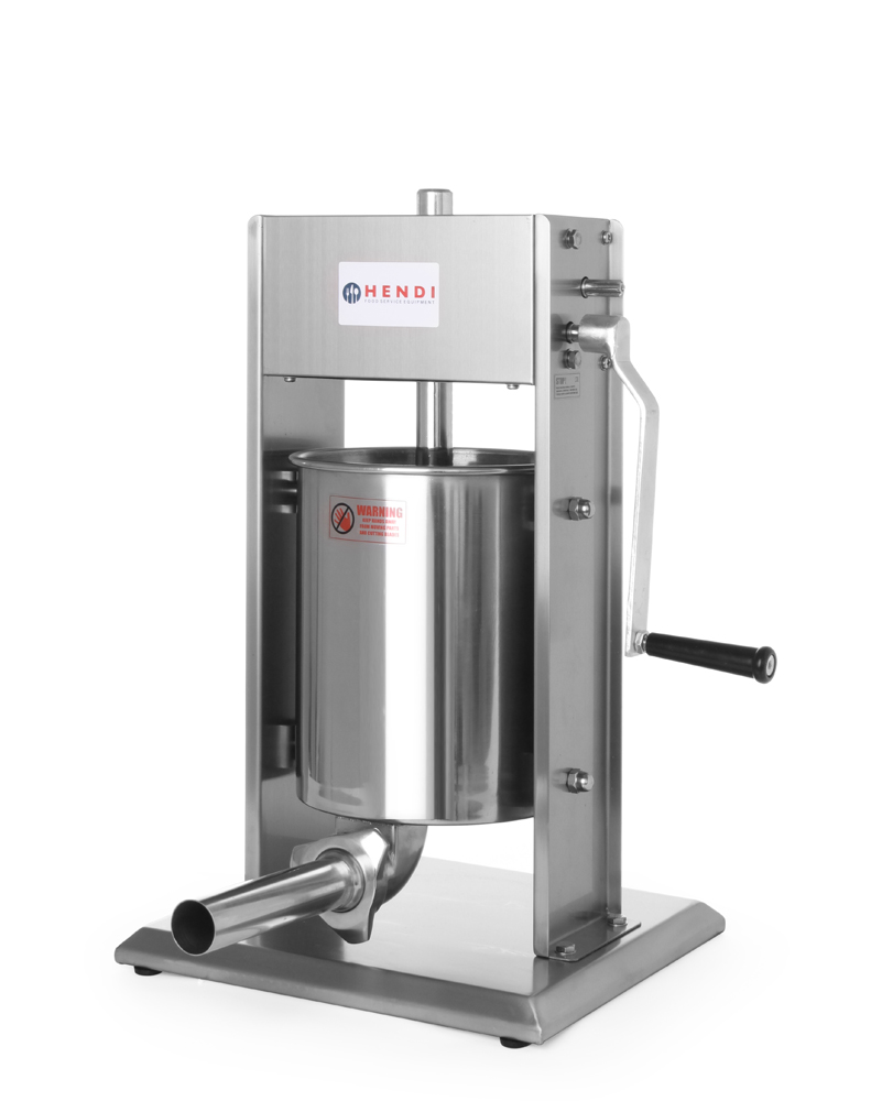 1. Aparat profesional pentru umplut cârnați Hendi Profi Line, versiune verticală, capacitate 10 l, 2 viteze umplere, corp din inox, 4 pâlnii incluse