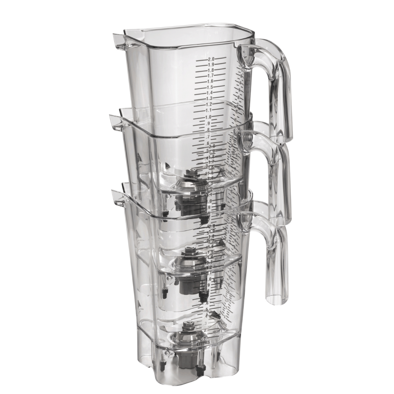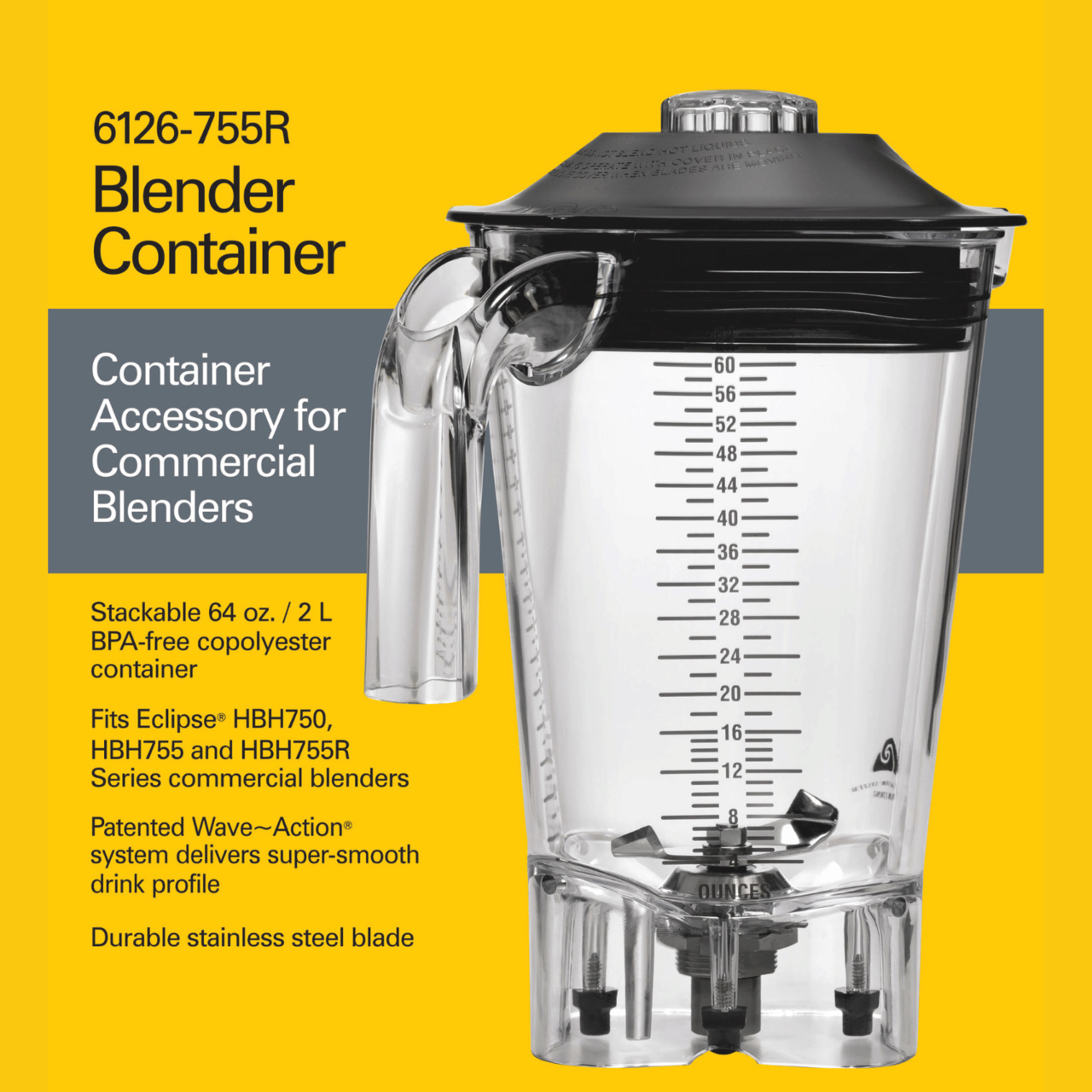 Un vas gradat transparent din copoliester, cu o capacitate de 2 litri. Acest vas este un accesoriu pentru barman, compatibil cu blenderul Hamilton Beach Commercial  HBH 755R ECLIPSE®  . Vasul este dotat cu sistemul Wave~Action®, care împinge continuu amestecul din interior în jos, către lame, creând un smoothie perfect. De obicei, designul vasului și al lamelor face ca conținutul vasului să se rotească în jurul pereților, ceea ce poate face ca nu tot conținutul să ajungă la lame, putând rămâne bucăți mai mari.