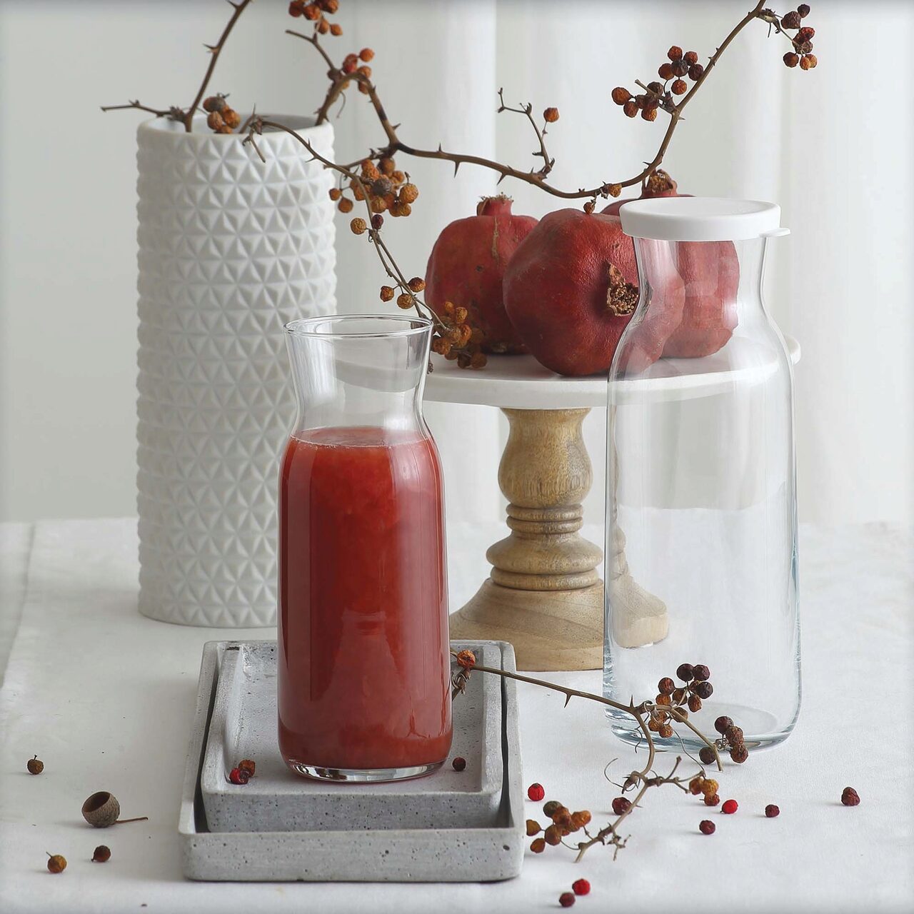 De la suc de roșii la apă, carafa Chelsea de 1,2 l (40 oz) poate conține orice băutură doriți.Cu carafele din sticlă Fonte de înaltă calitate, puteți ajuta planeta folosind mai puțin plastic.Începeți-vă ziua cu suc proaspăt stors, lapte sau orice băutură, de la alcoolică la non-alcoolică. Capacitatea funcțională va mulțumi fiecare oaspete!O caracteristică cheie a carafei este capacul alb din plastic dur, care vă protejează băutura de orice accidente nedorite. LAV Chelsea  vă protejează în siguranță băutura în timpul grătarelor, campingului sau picnicurilor în familie!La fel ca alte produse LAV, sticlele Fonte pot fi folosite și în multe scopuri. Dacă este necesar, carafa Chelsea poate fi folosită ca o frumoasă vază de sticlă, care, însoțită de flori, vă va decora și înveseli masa.