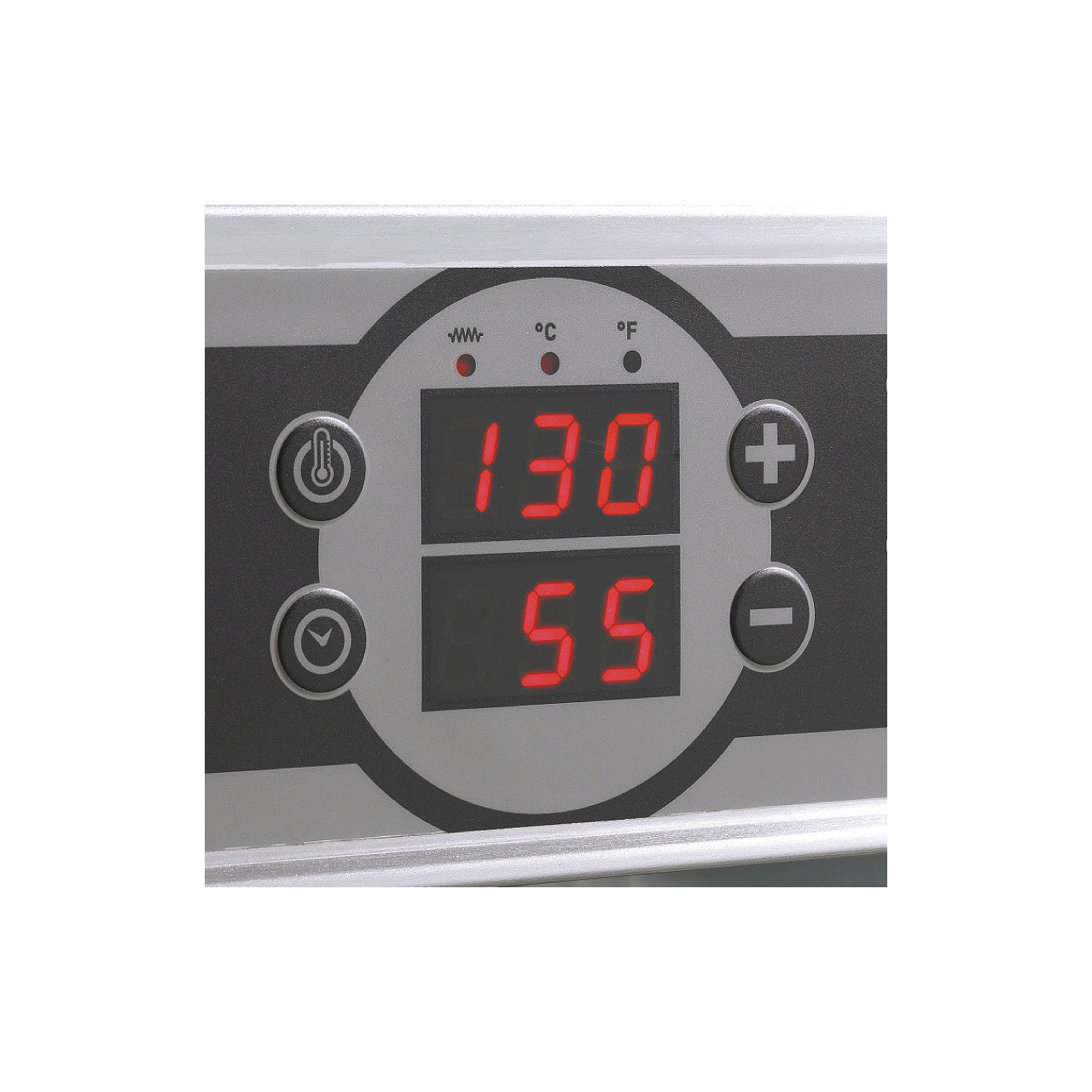 - Panoul de comandă digital are indicatoar pentru termostat și indicator pentru aburi și trei butoane mari pentru reglarea timpului, temperaturii și cantității de aburi. Timerul poate fi setat la 120 de minute, temperatura până la 260˚C.
