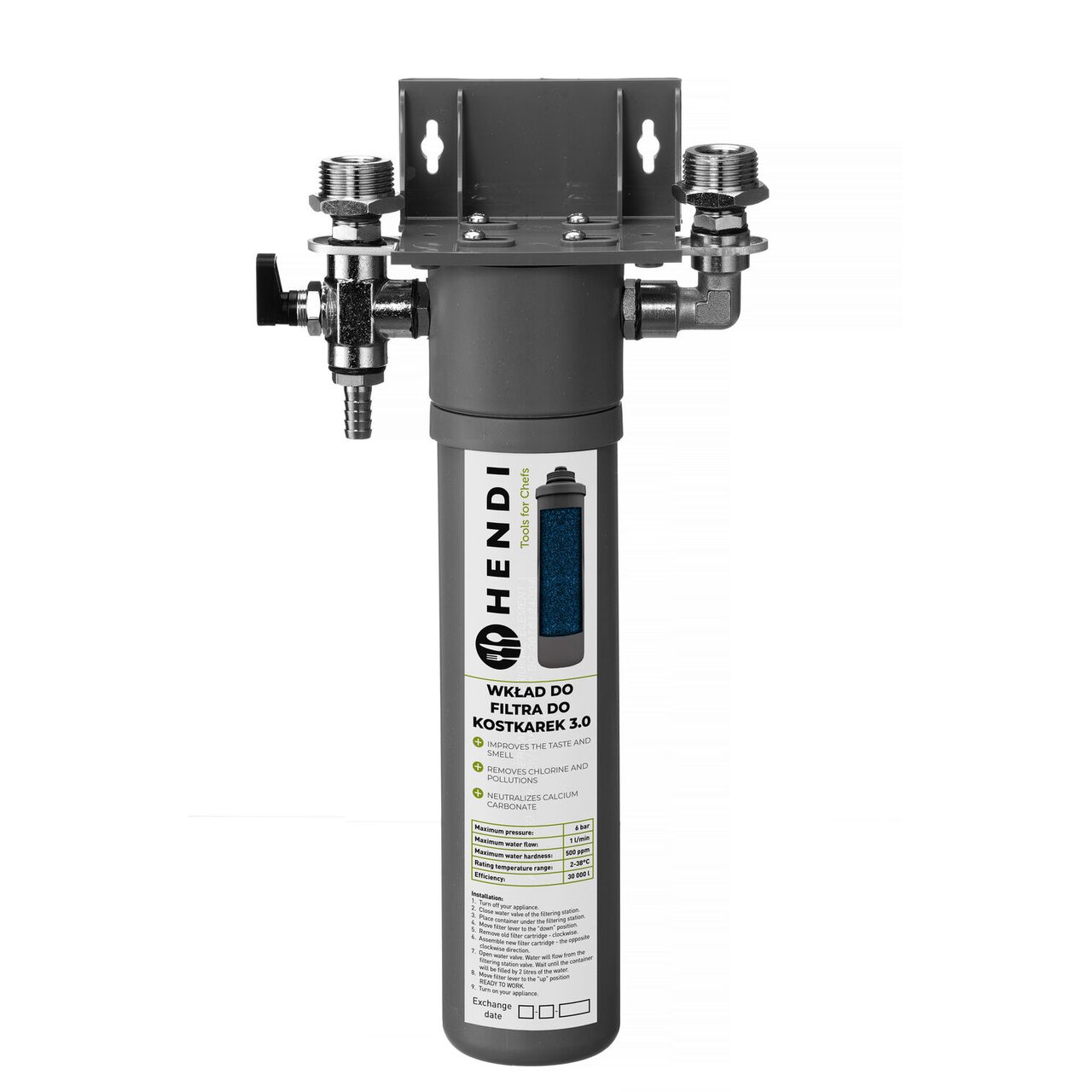 Debit maxim: 1 l/min. Duritate maximă a apei: 500 ppm.