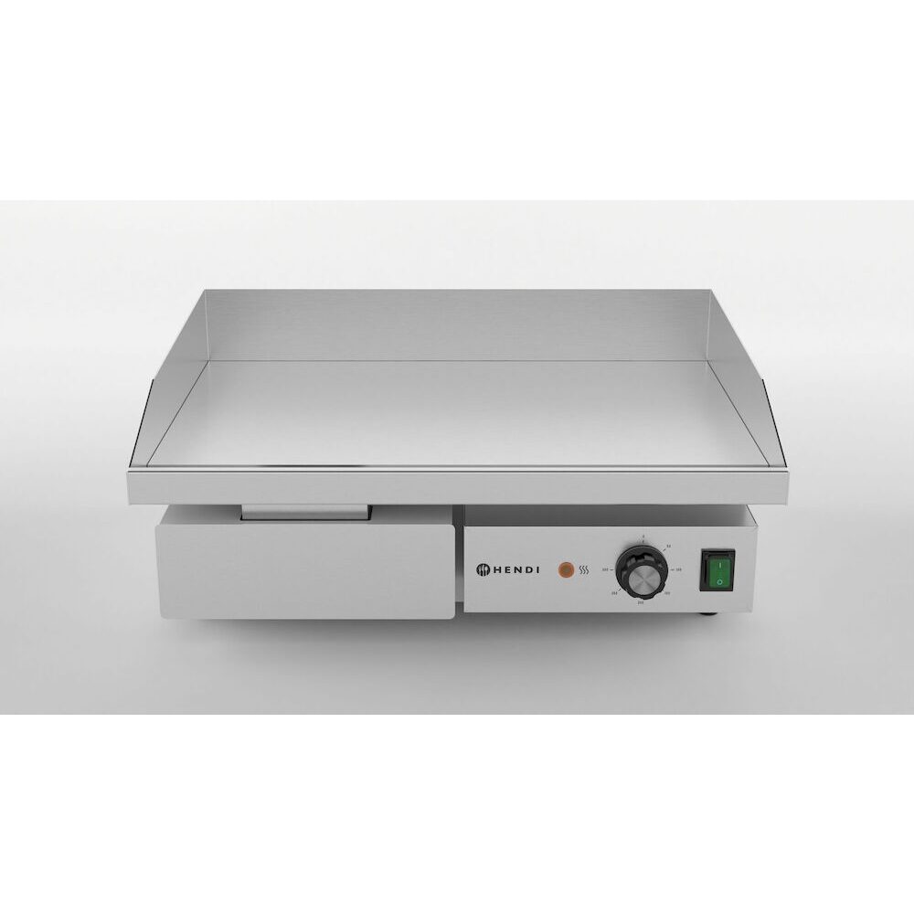 Grătarul plat HENDI Griddle este echipat cu o suprafață de gătit din oțel tratat, care poate atinge temperaturi de până la 300°C, fiind ideală pentru prepararea burgerilor, fripturilor, cârnaților, ouălor sau clătitelor.”