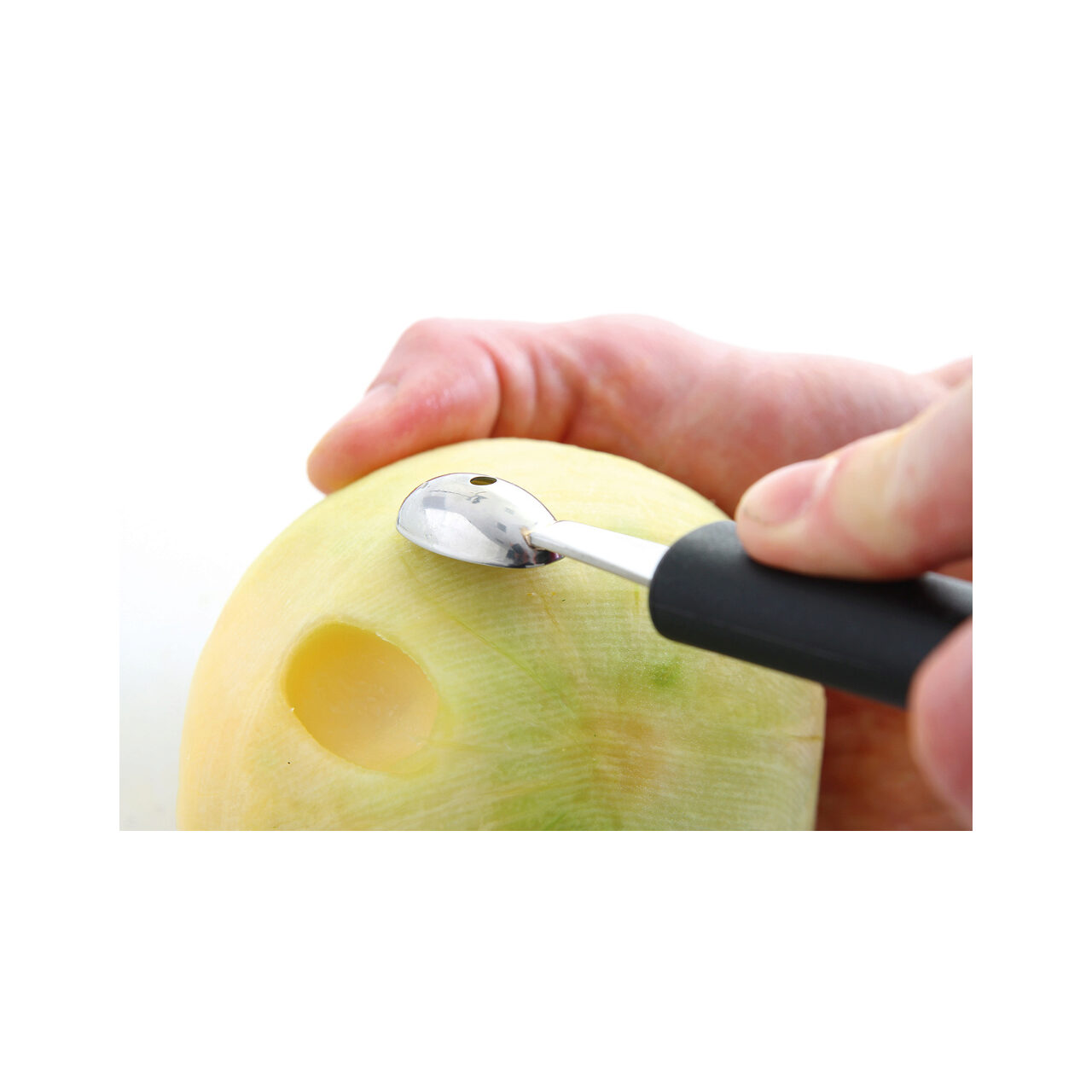 Lingurita pepene ovala. Lama din otel inoxidabil. Maner din polipropilena. Se poate spala la masina de spalat vase. Lungime 165 mm. Diametru 26 mm.