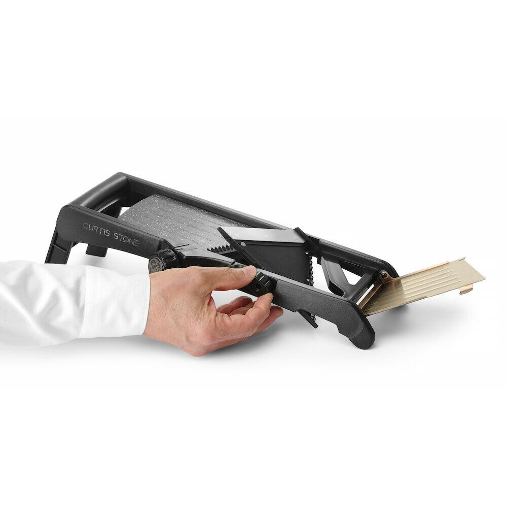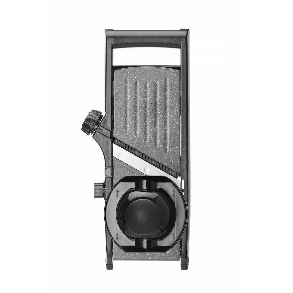 Constructie robusta: elemente fabricate din otel inoxidabil, ABS si polipropilena. Suprafata plata din otel este impartita in doua parti, care pot fi deschise pentru acces usor la lame, in vederea reglarii, indepartarii sau curatarii acestora. Suprafata are un strat antiaderent din PTFE care faciliteaza taierea foarte lina (legumele/fructele gliseaza foarte lin). Lame extrem de ascutite in cateva variante care ofera diferite efecte de taiere - dar intotdeauna foarte precise si consecvente: - 2 lame plate situate pe o piesa inversata: lama neteda sau zimtata, - rola detasabila si rotativa cu lame zimtate; grosimea si tipul de taiere pot fi reglate cu usurinta cu un buton: de la 0,5 mm la 9 mm, felii sau julienne. Lamele plate sunt amplasate la un unghi pentru un proces de taiere mai rapid si mai convenabil.
