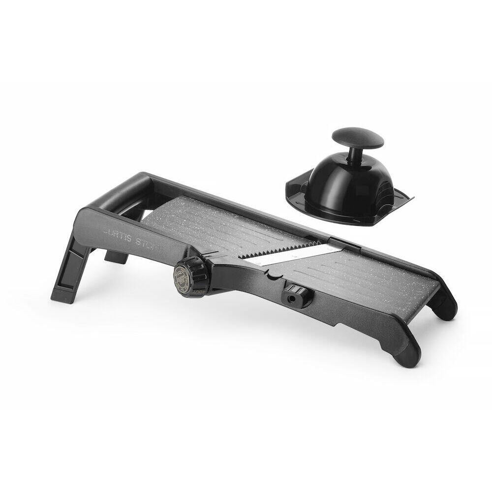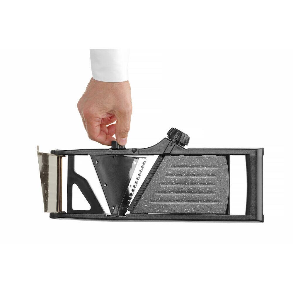 Rola prevazuta cu protectie. Pozitia pentru scoaterea rolei este marcata cu buton rotativ. Carligul bolului si picioarele anti-alunecare sunt fabricate din cauciuc termoplastic (TPR), asigurand stabilitate completa in timpul functionarii. Cu un picior lat retractabil suplimentar - confort ridicat la utilizare, este posibil sa taiati legumele  tinand mandolina in mana sau atunci cand este asezata pe blatul de lucru la un unghi de 45 grade. Accesoriile care asigura functionarea in siguranta sunt incluse in set: - protectie/suport pentru degete, pentru protejarea degetelor si mentinerea legumelor/fructelor cu 6 tepi subtiri, - protectie lama confectionata din material sintetic pentru fixarea lamei exterioare.