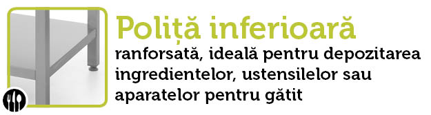 Masa de lucru Hendi este dotata cu o polita inferioara ranforsata care ofera durabilitate, rezistenta si faciliteaza depozitarea cat si accesul rapid pentru orice ingredient din bucatarie.