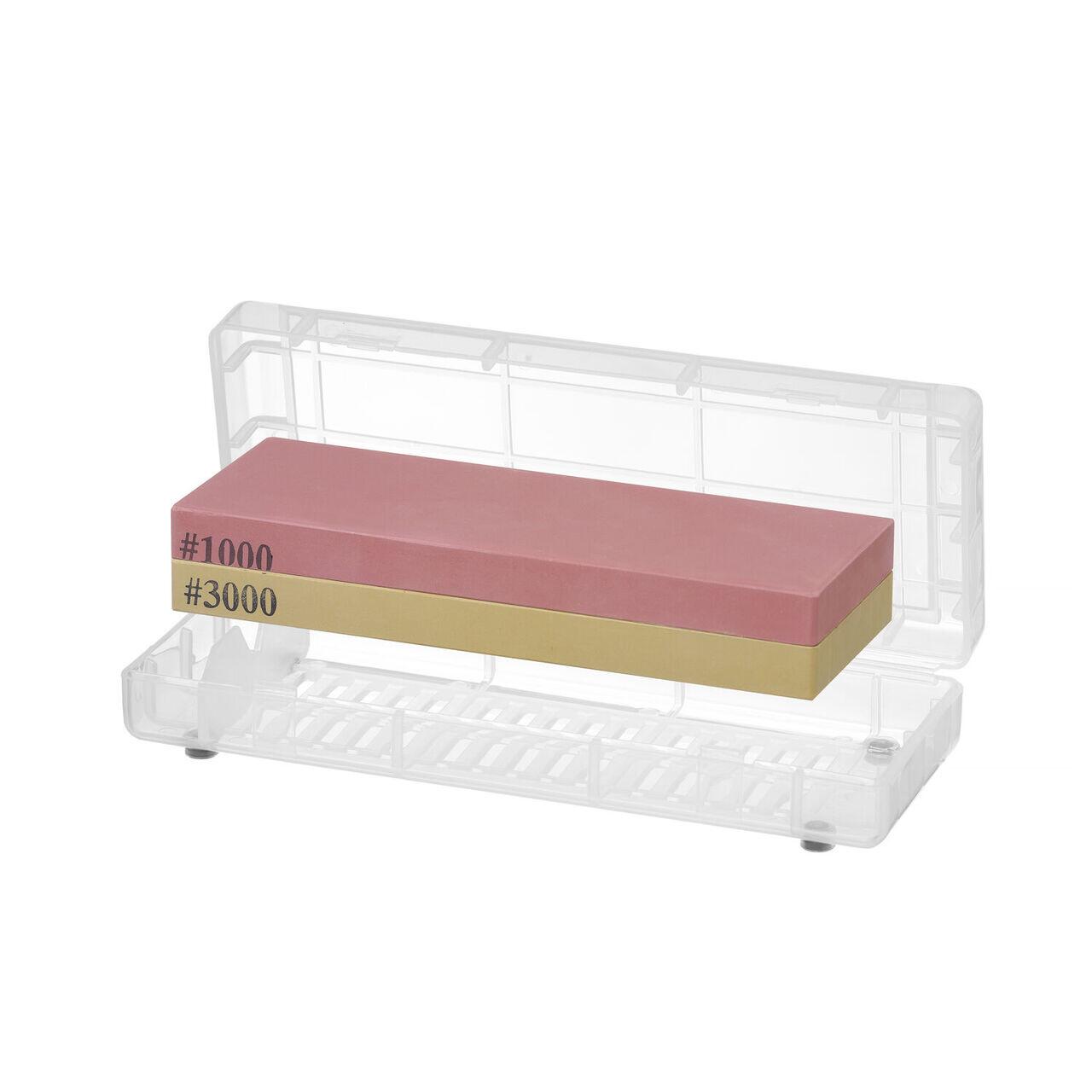 Ascuțitorul este cu două fețe și combină 2 plăci cu 2 granule diferite.