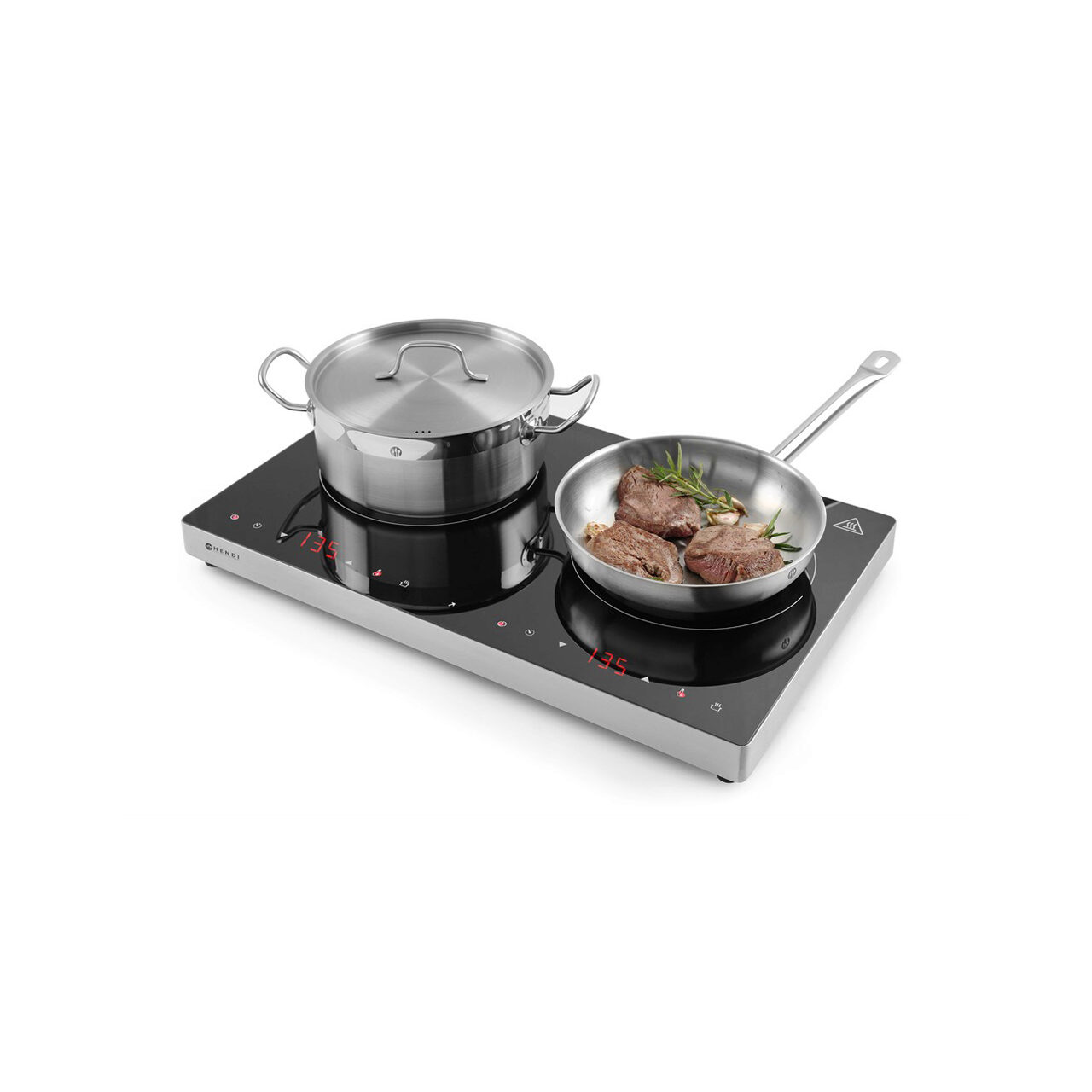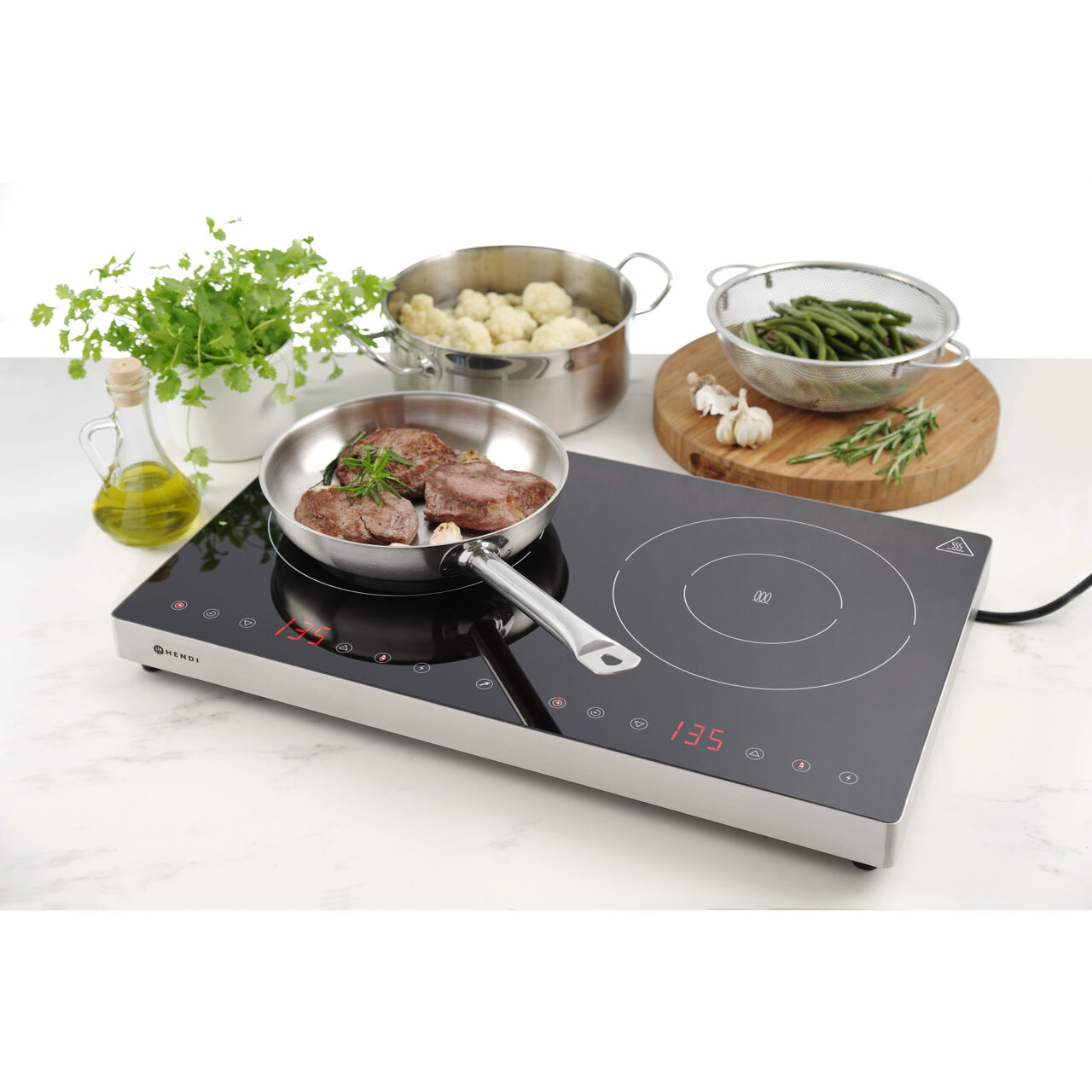 Plita dubla cu inductie profesionala, 3500W, control digital incorporat in suprafata din sticla ceramica, termostat 60-240°C, timer 0-180 min, functie boost, corp inox, ?Hendi Display Line, 608x370x(H)61 mm?