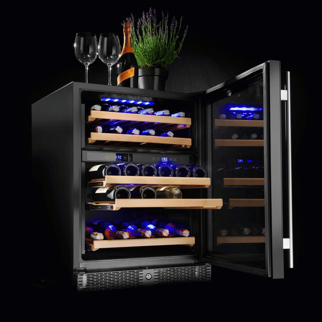 Datorită celor două zone și a intervalului reglabil de temperatură (+5°C până la +22°C), în frigider pot fi depozitate simultan diferite tipuri de vin. Monitorizarea și reglarea temperaturii se fac ușor prin afișaj digital și termostat electronic (°C sau °F).