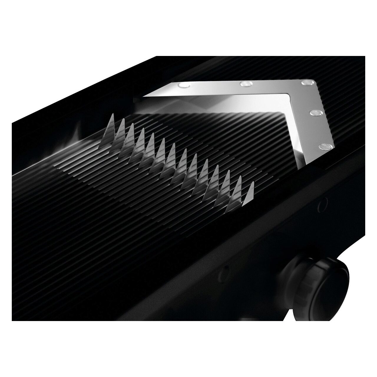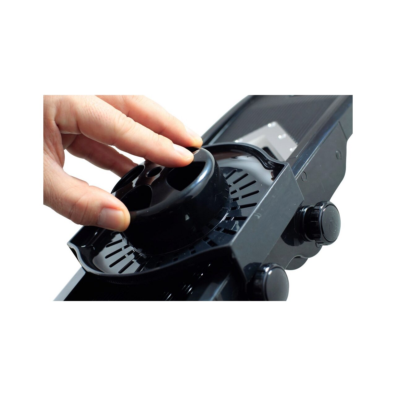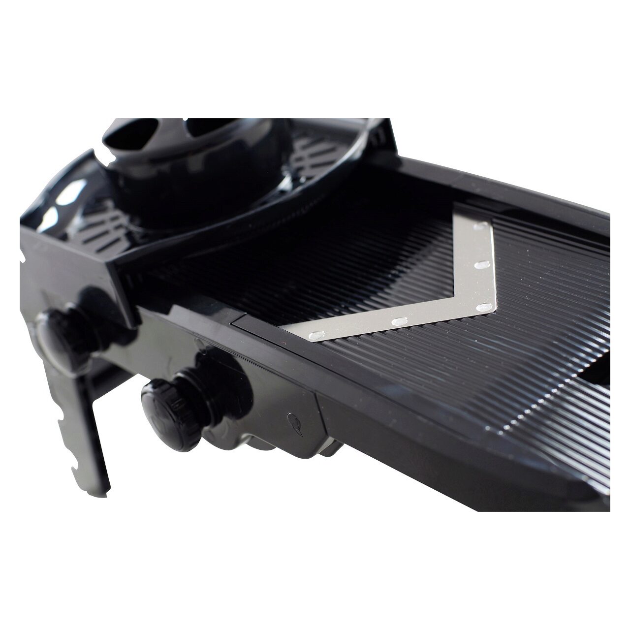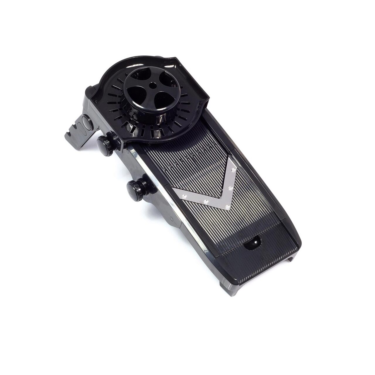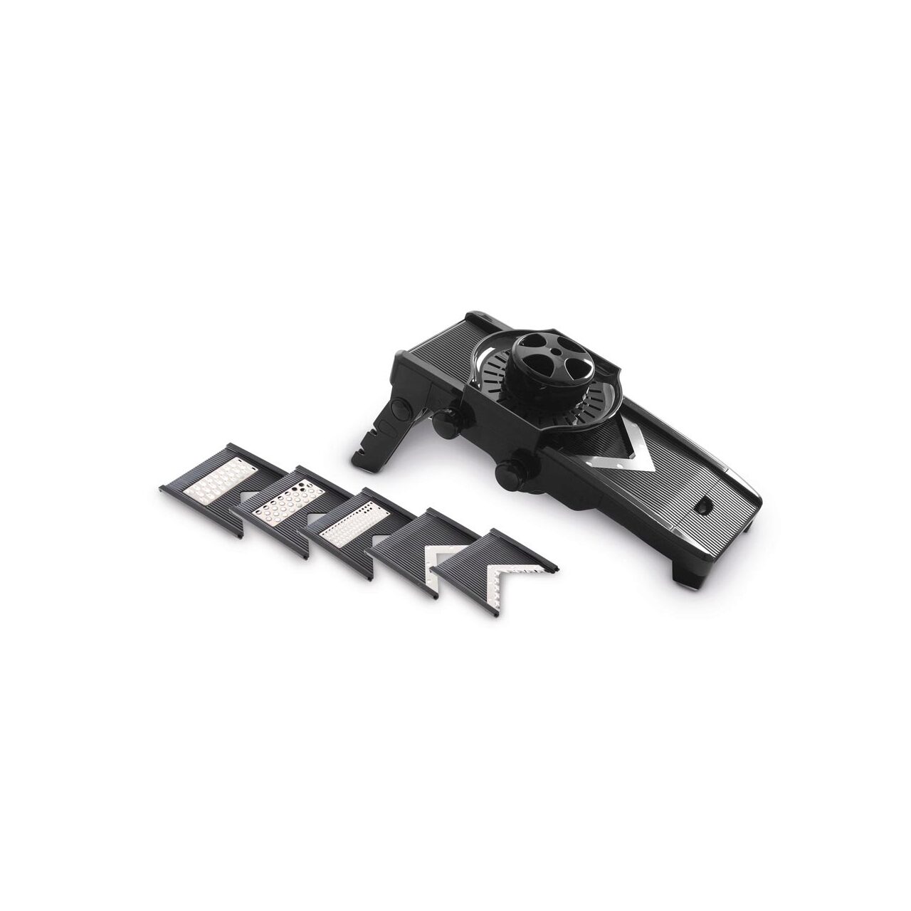 Taietor pentru legume, tiv V, din Plastic ABS si Polipropilena. Se poate spala la masina de spalat vase. Confectionat din plastic rezistent negru Include 5 lame din otel inoxidabil de inalta calitate Suport pliabil cu picioare din cauciuc Lame taiere in forma de V. Lamele pentru julienne si cartofi french de 6 mm sau 9 mm. Grosimea feliei reglabila de la 1 mm la 9 mm.
