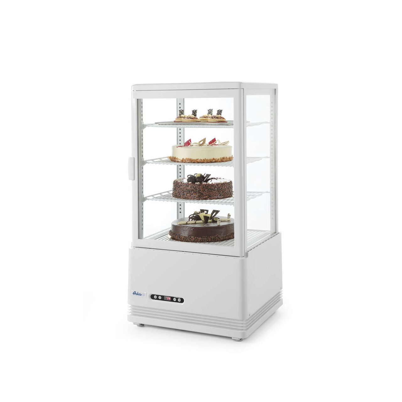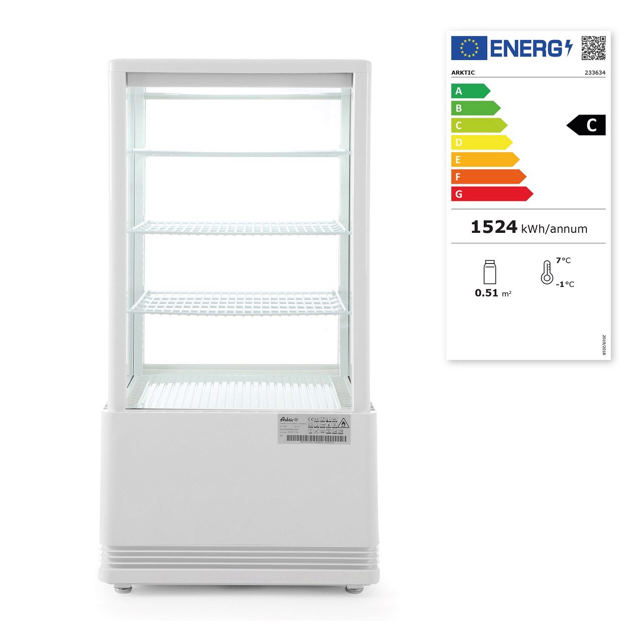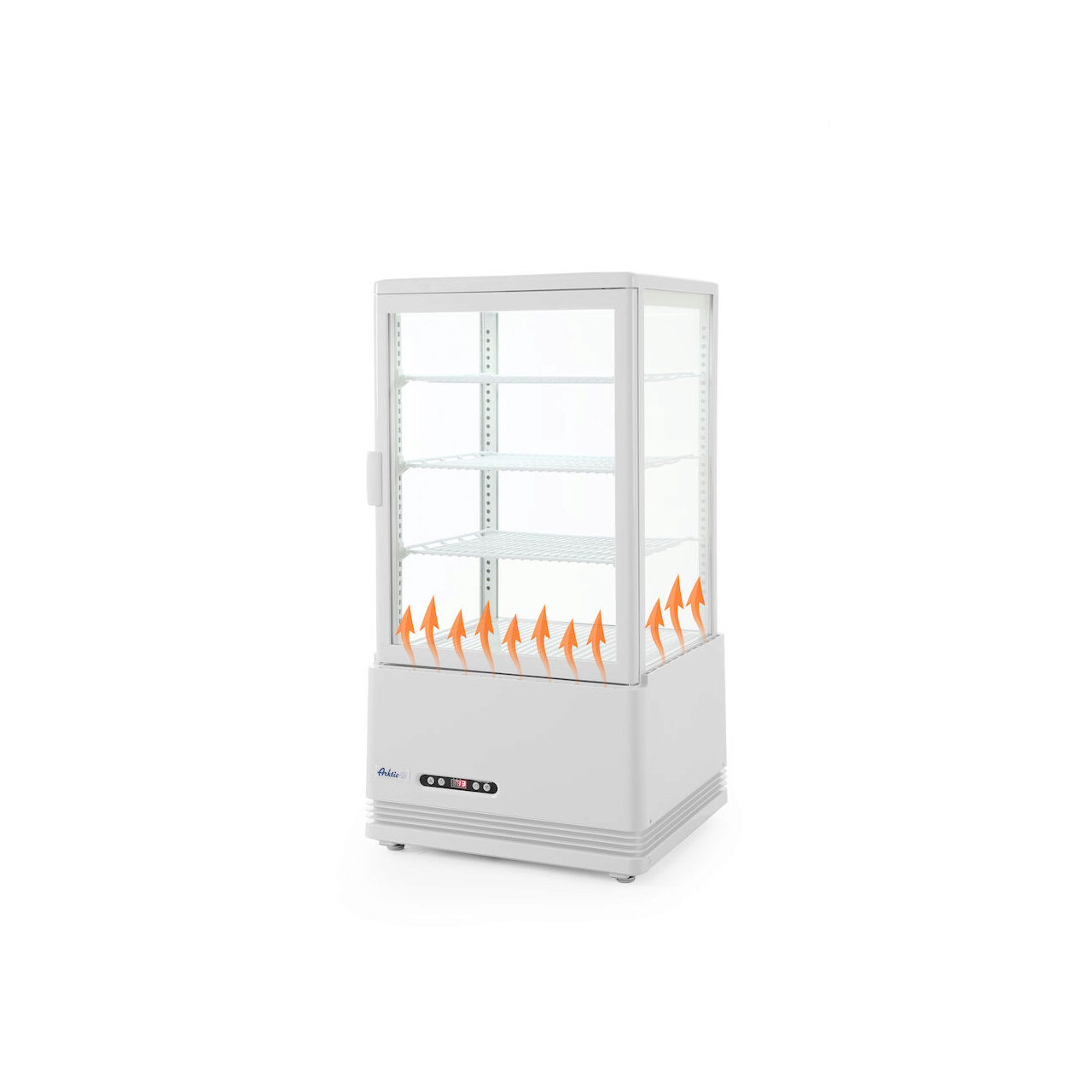 Vitrina rece pt prezentare, alba, 68 lt, interval temp 0-12 gr C, 170 W, 3 rafturi reglabile pe inaltime, ARKTIC by Hendi, 452x406x(H)891 mm, Clasa energetica C